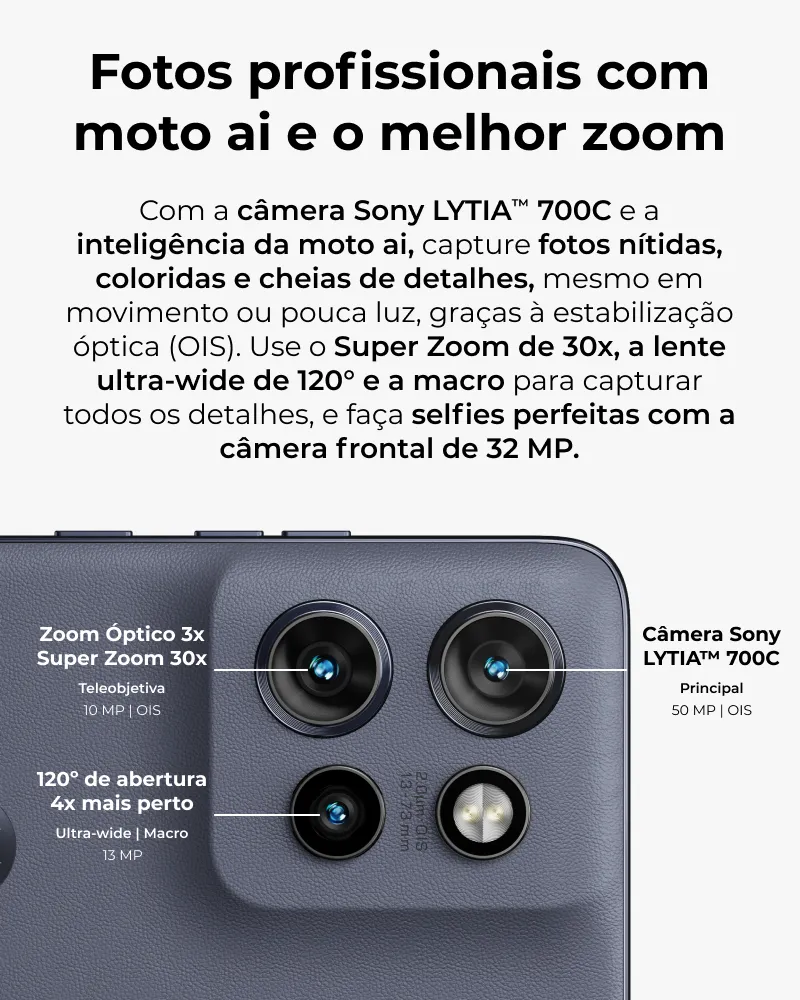 O conjunto de câmeras do Edge 60 Neo é outro grande destaque. A câmera principal utiliza o sensor Sony LYTIA™ 700C de 50 MP, com estabilização óptica de imagem (OIS), entregando fotos mais nítidas mesmo em movimento ou em ambientes com pouca luz.