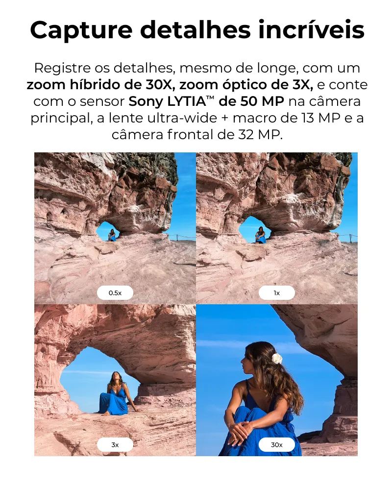 • Câmera traseira: 50 MP (Sony LYTIA 700C + OIS) + 13 MP + teleobjetiva