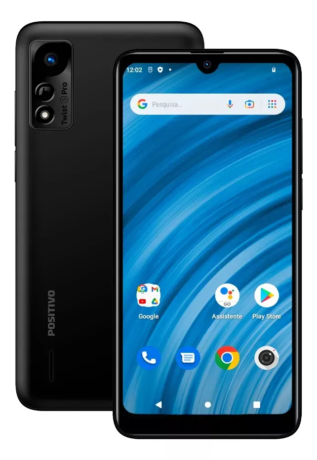 O Positivo Twist 5 Pro roda Android 12 Go, uma versão otimizada do sistema, desenvolvida para celulares com hardware mais simples.